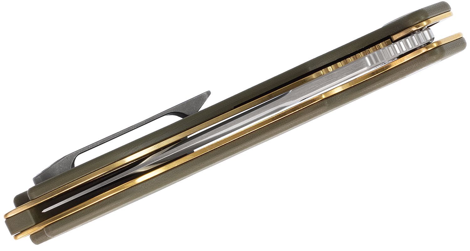 Aquila - een model ontworpen voor dagelijks gebruik. Het lemmet is gemaakt van Japans roestvrij staal VG-10 met een Satin Finish. Het "loopt" op keramische kogellagers, wat zorgt voor een soepelere werking. Het kan worden geopend met een duimgat in het lemmet of een Flipper. Het geopende mes wordt vergrendeld door een Liner Lock. Het handvat is gemaakt van groen G10-materiaal. Het is versterkt met roestvrijstalen liners in een gouden kleur. De clip voor zakdragen is gemaakt van titanium. Het is tweepositioneel, zodat je het naar behoefte kunt verplaatsen. Het mes heeft een koordgat voor het gebruik van een lanyard.