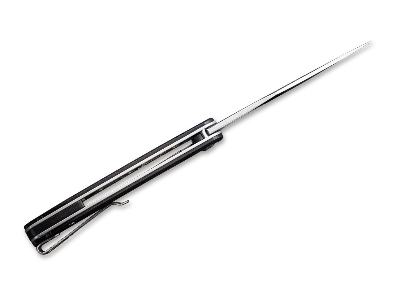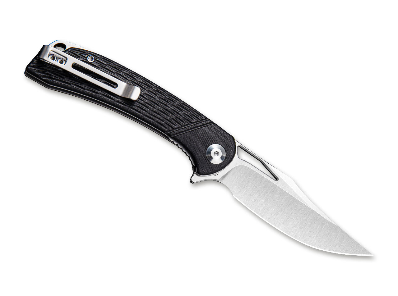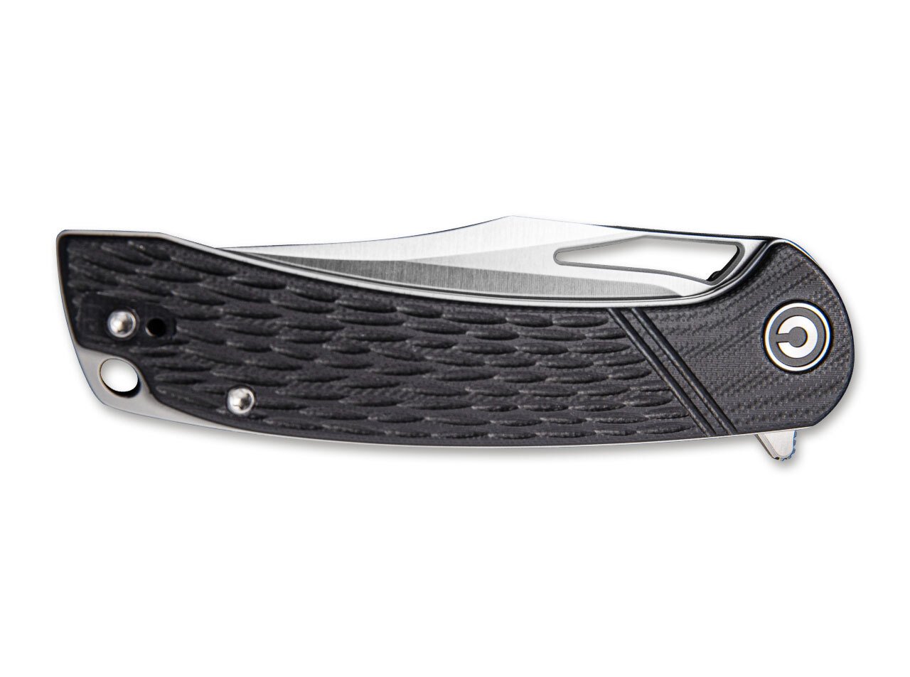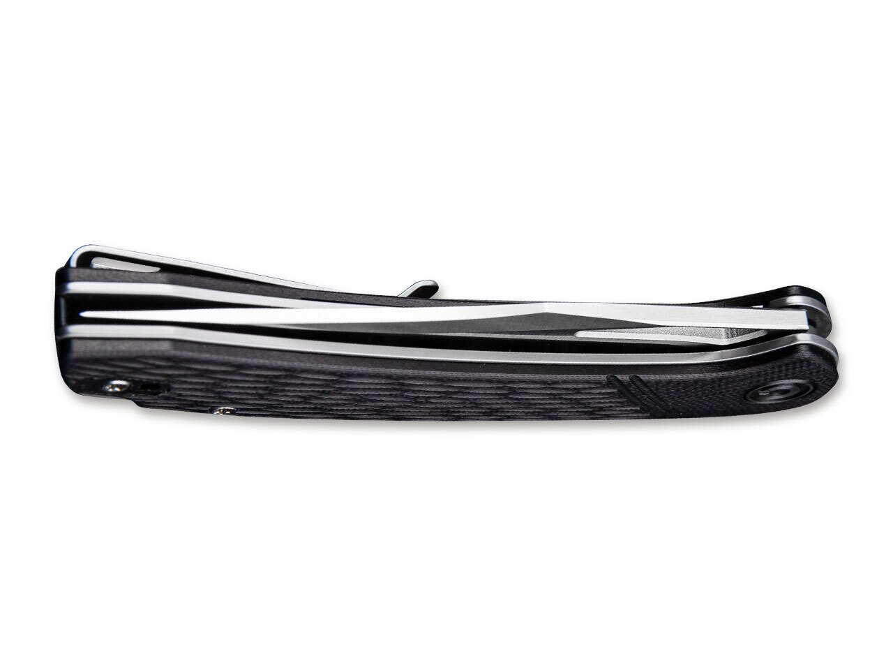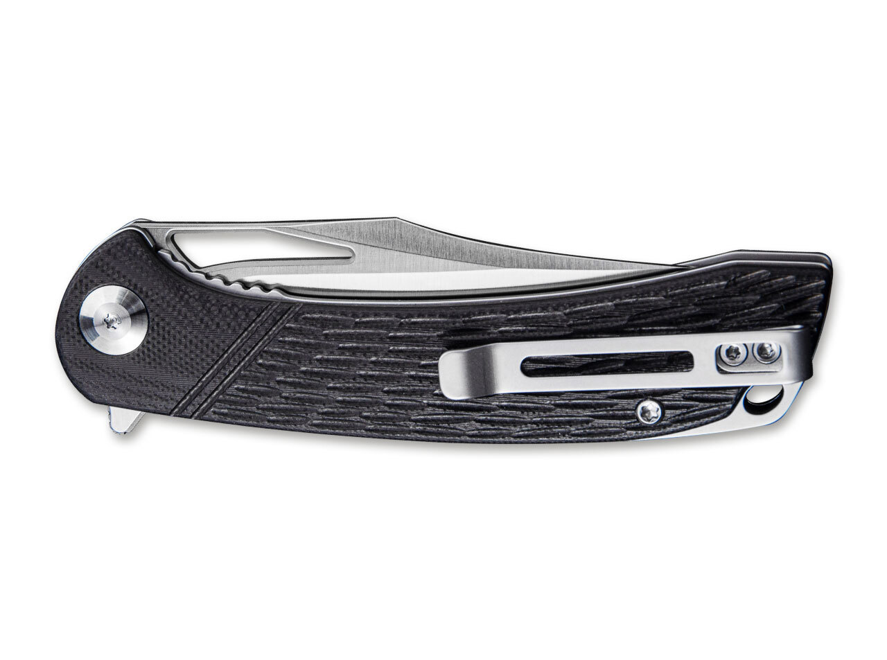 Het handvat met gefreesde fijne kuiltjes is gemaakt van zwart G-10. Het handvat heeft een opening voor het gebruik van een koord. De clip kan aan beide zijden van het handvat worden bevestigd, waardoor het ook geschikt is voor linkshandigen.