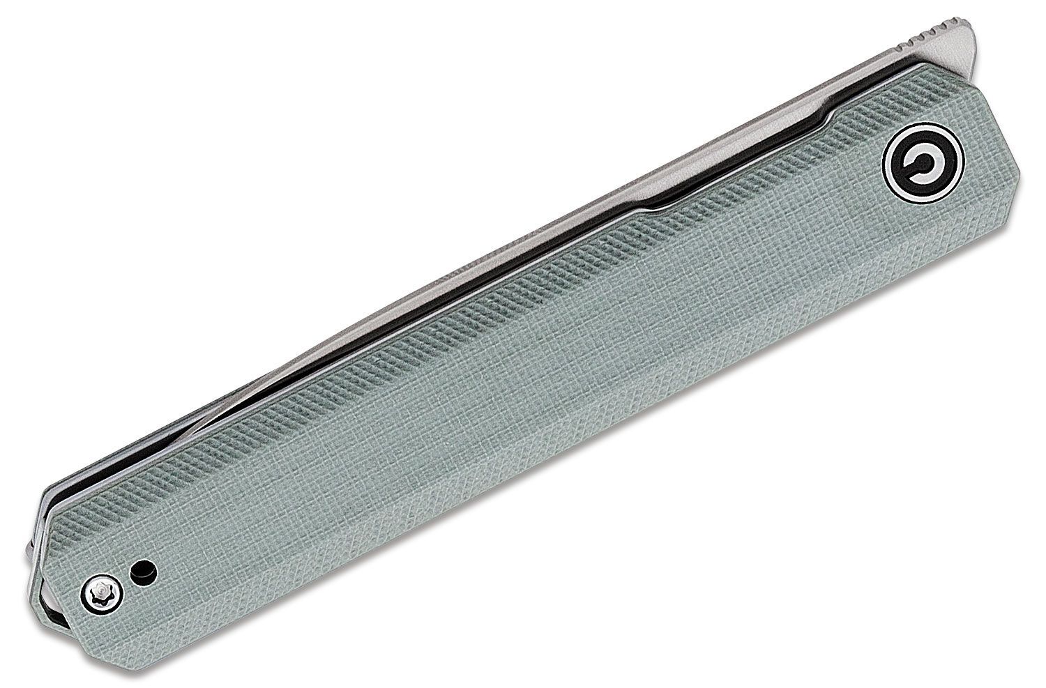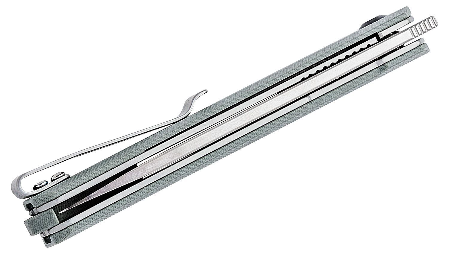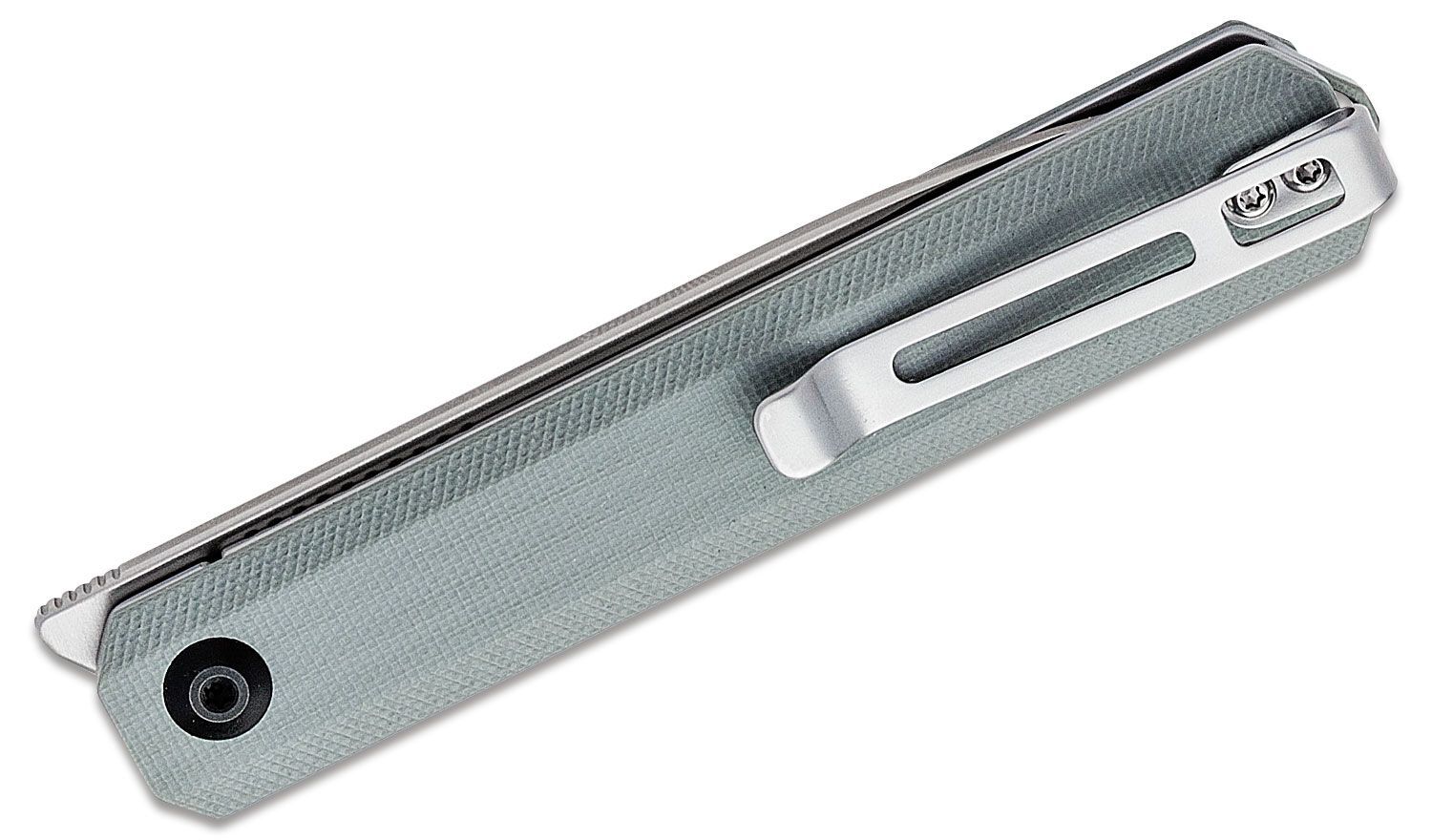 De handgreep is gemaakt van grijze G-10. Het handvat heeft een opening voor het gebruik van een koord. De clip kan aan beide zijden van het handvat worden bevestigd, waardoor het ook geschikt is voor linkshandigen.
