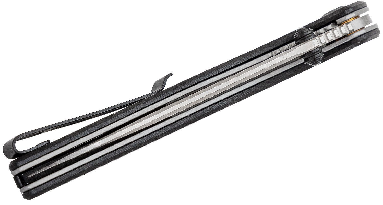 De Governor is een elegant, slank, licht en praktisch mes. Geschikt voor dagelijks gebruik. Als je een gereedschap wilt dat onopgemerkt blijft tijdens het dragen totdat je het nodig hebt, is de Governor ideaal. Het lemmet is gemaakt van gereedschapsstaal D2, (59-61HRC) met een Satin Finish. Het opent met een duimstud op het lemmet, met één hand, en "loopt" op bronzen washers. Het geopende mes wordt vergrendeld door een Liner Lock. Het handvat is gemaakt van G10-materiaal, in zwarte kleur, en versterkt met stalen liners. Het handvat heeft een koordoog en een clip voor zakdragen. De clip is tweezijdig, zodat je het gemakkelijk naar elke kant kunt verplaatsen. Het biedt een discrete en subtiele draagmogelijkheid. Uitstekende prijs-kwaliteitverhouding.