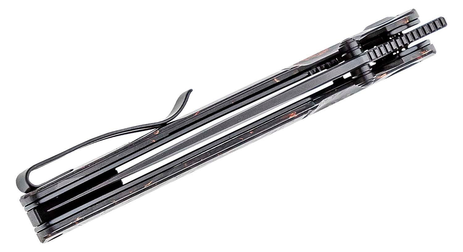 Het lemmet is gemaakt van roestvrij staal Nitro-V met een hardheid van 59-61 HRC en opent met een duimstud of via een Front Flipper. Het lemmet wordt vergrendeld door een Liner Lock. Het handvat is gemaakt van geplette koolstofvezels met stukjes koper ingebed in epoxy. Aan de zijkant van het handvat bevindt zich een clip voor het dragen in de broekzak.