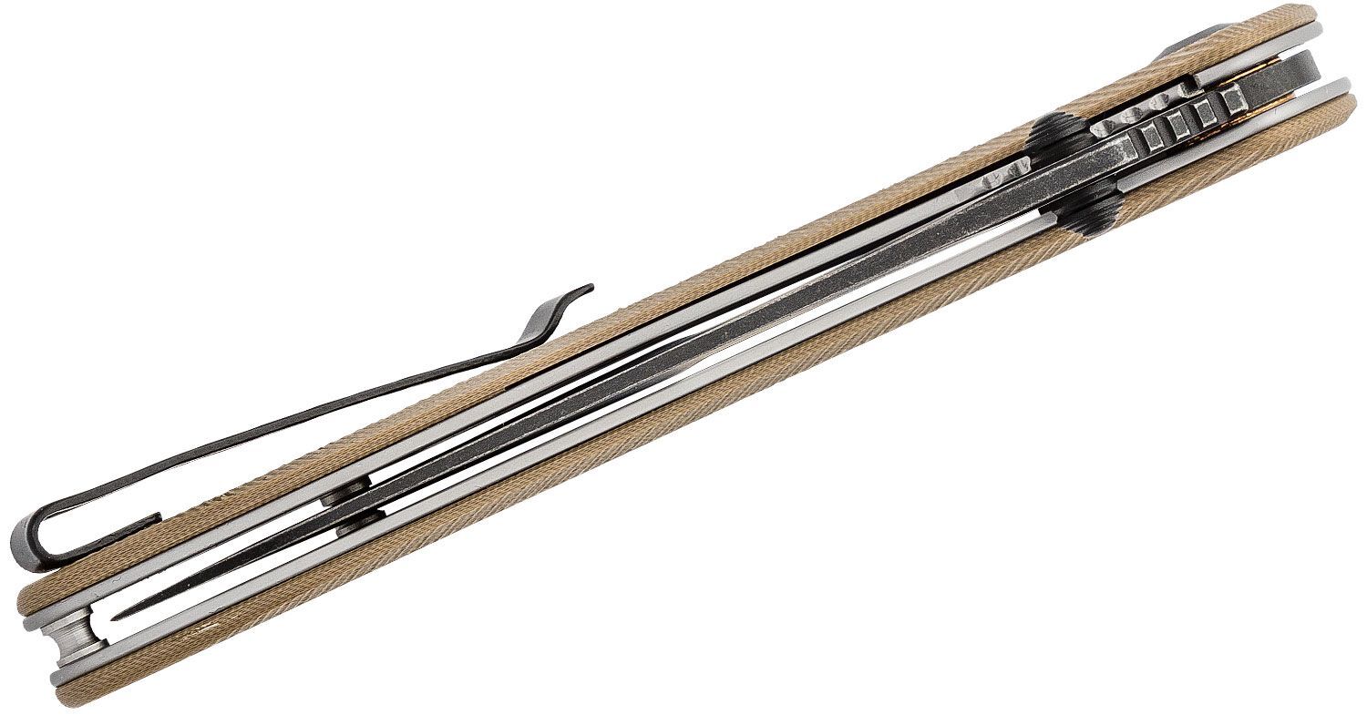 CIVIVI Picaro - Het lemmet heeft een Black Stonewash afwerking. Het is gemaakt van D2 staal met een hardheid van 59-61HRC. Het opent met één hand, met een duimstud op het lemmet. Het geopende lemmet wordt vergrendeld door een Liner Lock. Het handvat is gemaakt van G10 Tan materiaal. Het is versterkt met stalen liners. Het heeft een koordgat voor het gebruik van een lanyard. De broekclip is zwart en tweezijdig, zodat je hem naar behoefte aan de andere kant van het handvat kunt verplaatsen. Dit maakt discreet en onopvallend dragen mogelijk.