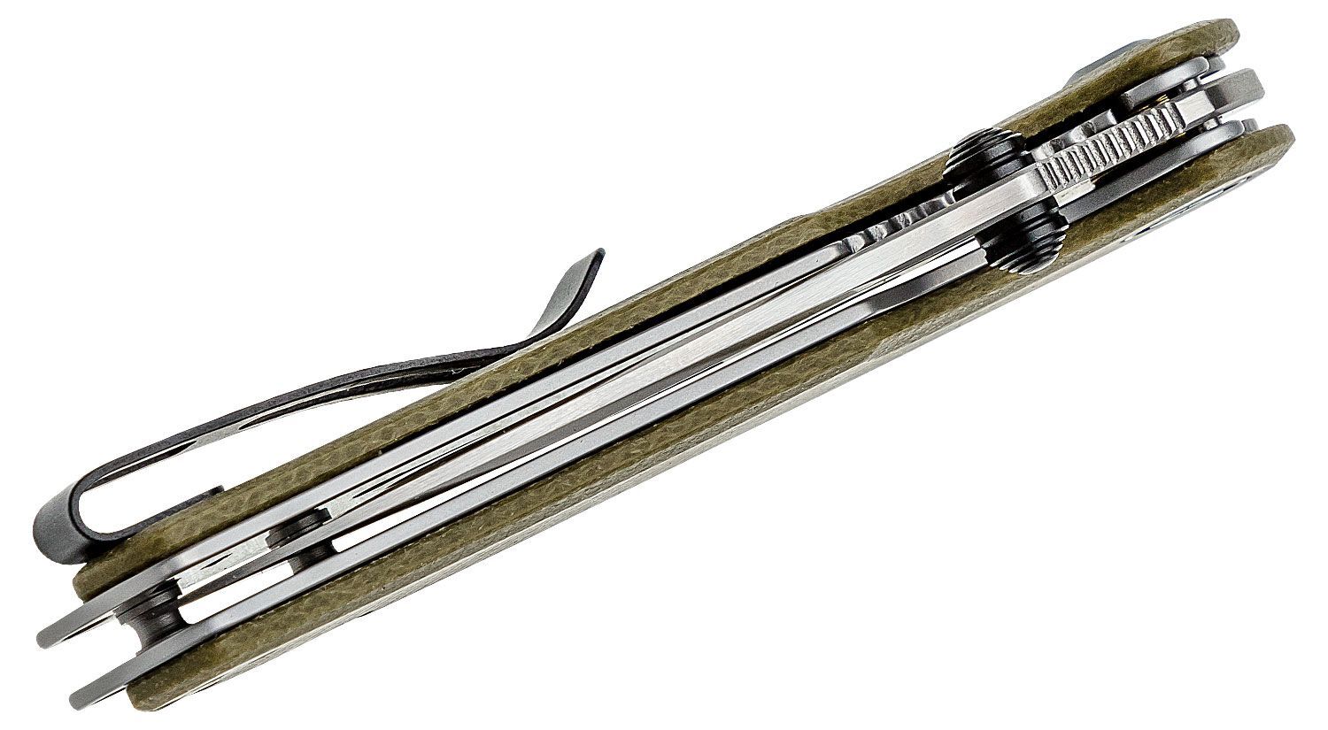 Het brede lemmet is gemaakt van roestvrij staal CPM-S35VN met een hardheid van 59-61 HRC, beveiligd met een Liner Lock. Het handvat is gemaakt van duurzaam micarta. Een clip voor zakdragen en een koordoog.