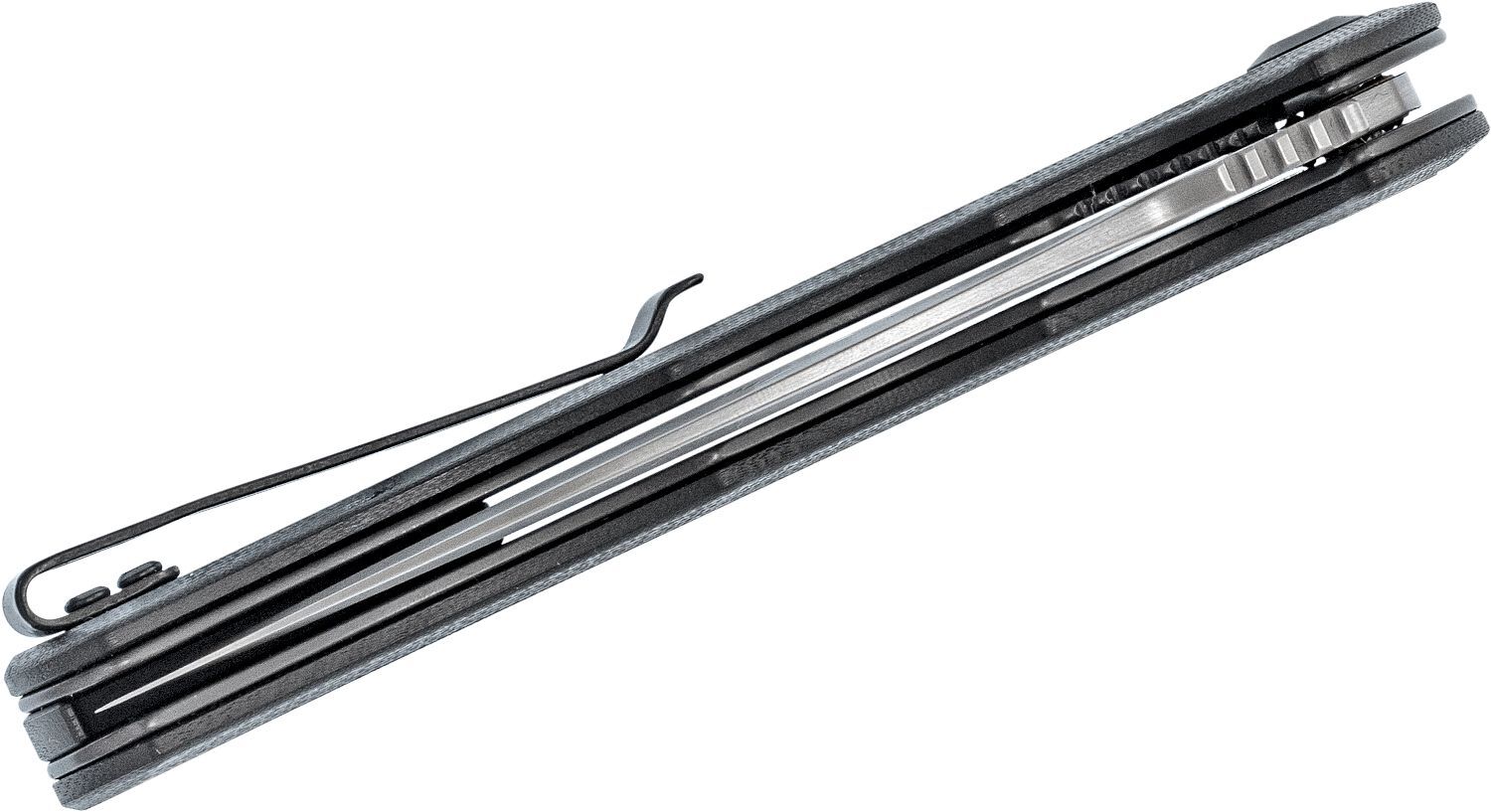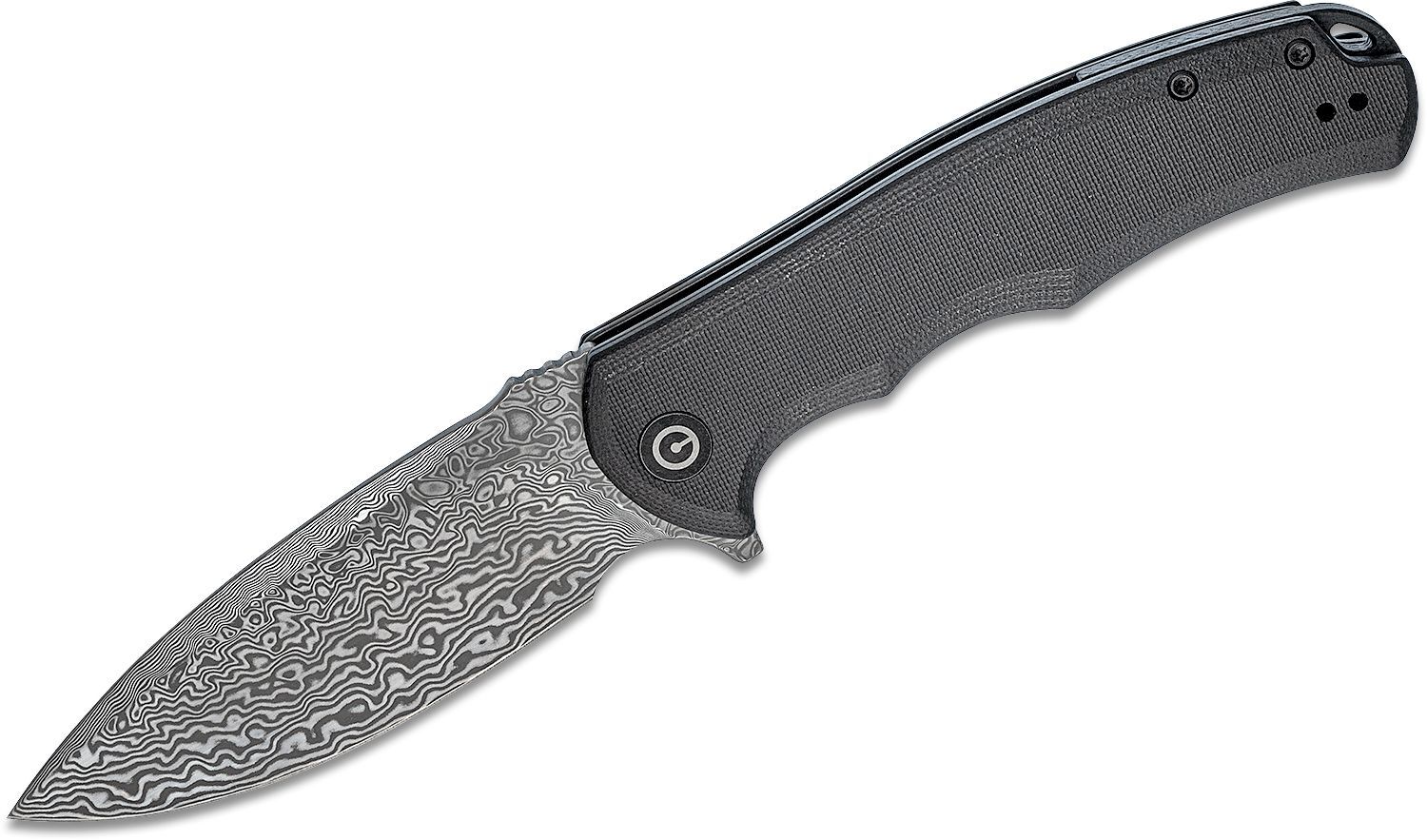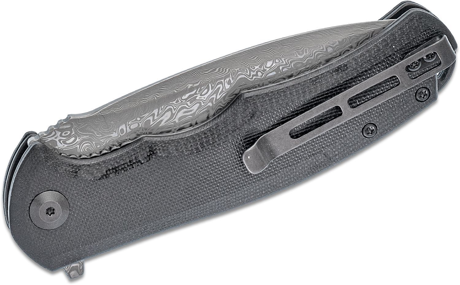 Het lemmet is gemaakt van Chinese Damascus staal, dat "loopt" op roestvrijstalen kogellagers, wat het openen vergemakkelijkt. Het mes opent eenvoudig met behulp van een Flipper. Het geopende lemmet wordt vergrendeld door een Liner Lock. Het handvat is gemaakt van zwart G10 materiaal. De clip is tweepositioneel, zodat je deze naar wens kunt aanpassen. Het handvat heeft een koordgat.