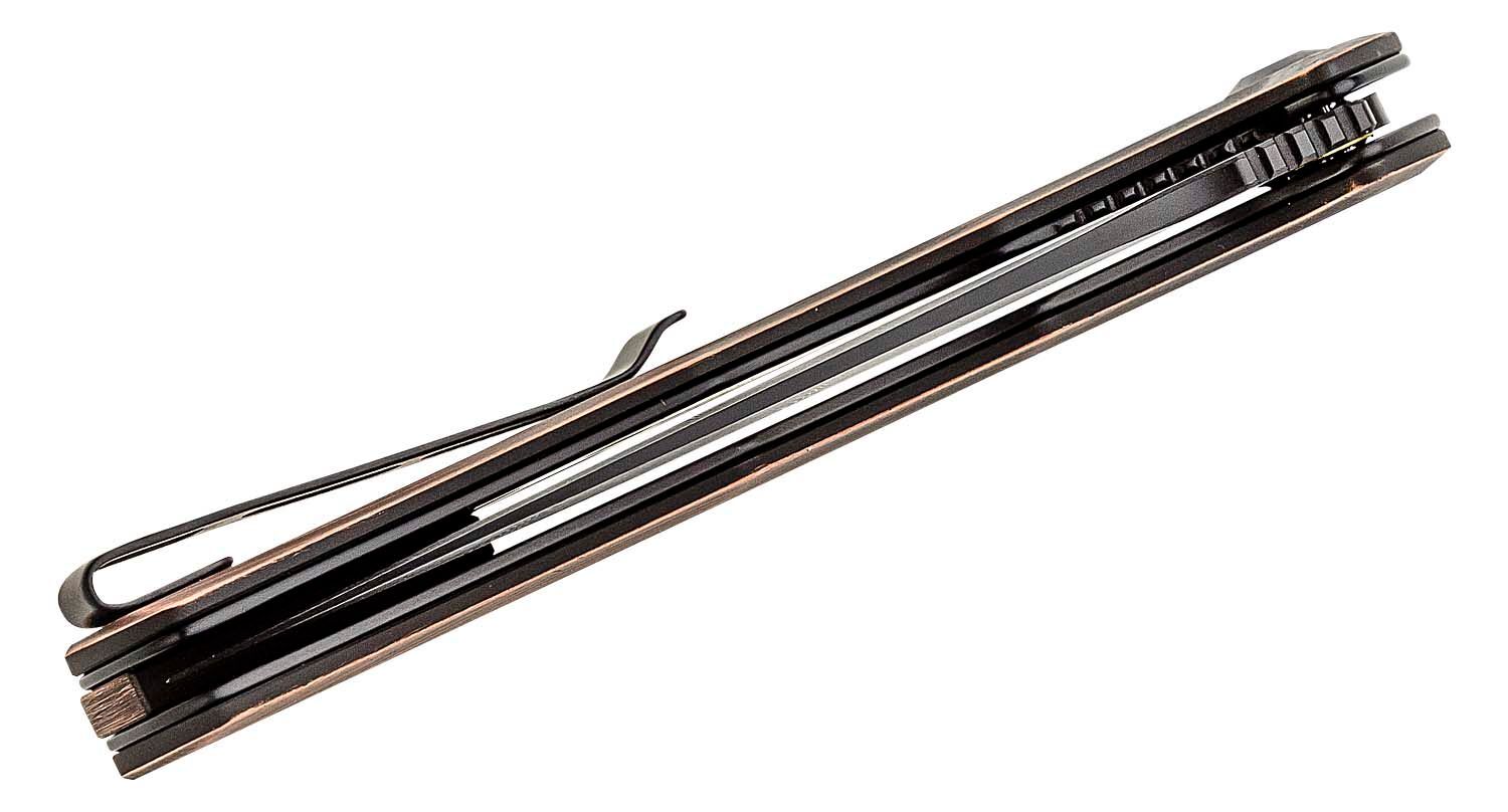 Het lemmet, gemaakt van Damascus staal, wordt geopend met behulp van een Flipper. Het geopende lemmet wordt vergrendeld door een Liner Lock. Het handvat is gemaakt van koper. Op het handvat bevindt zich een koordoog, en het mes is uitgerust met een clip voor draaggemak in de zak.