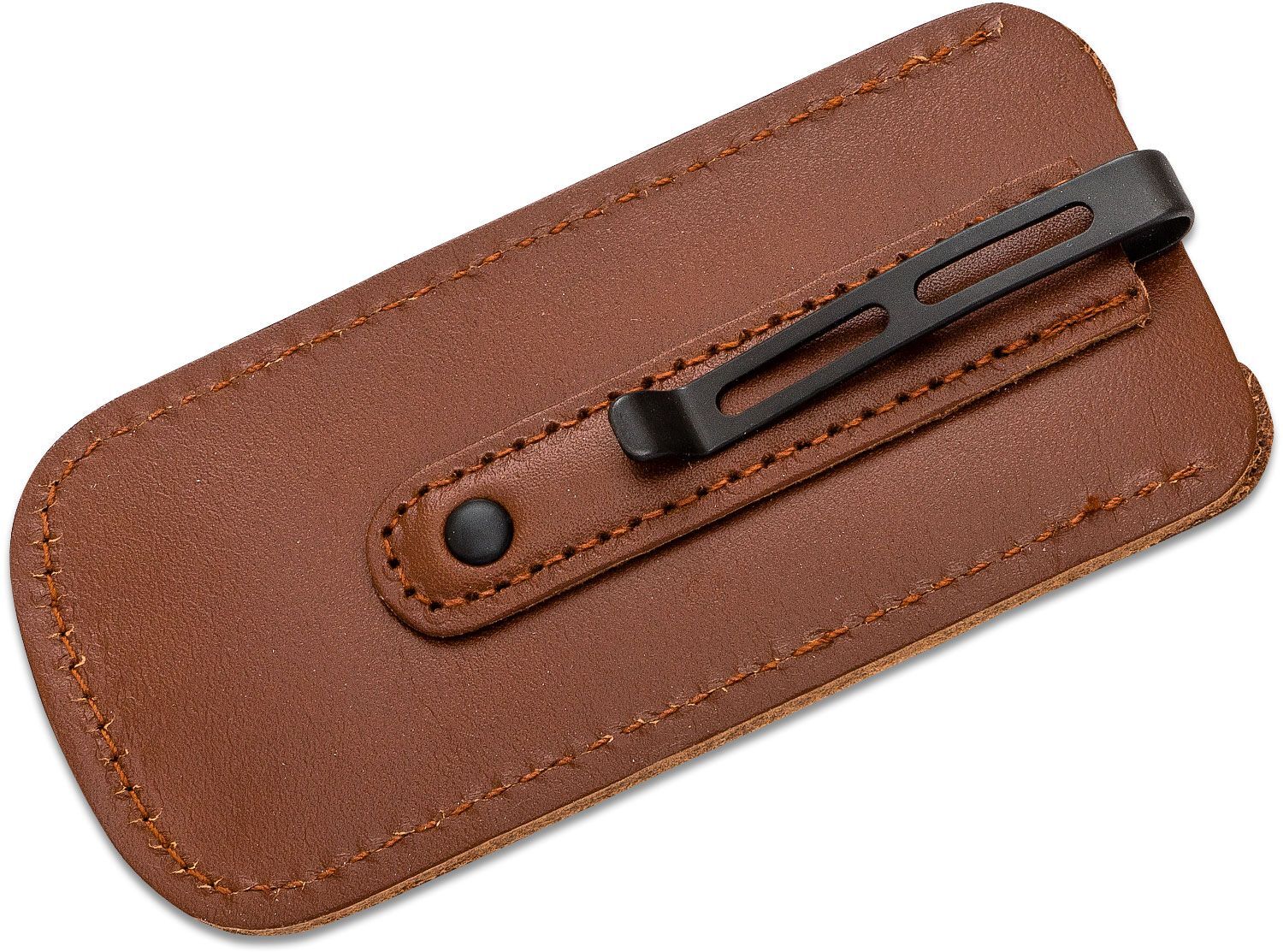 Het mes wordt geleverd met een hoes van natuurlijk leer, die een zwarte clip van roestvrij staal heeft, wat gemakkelijk dragen mogelijk maakt.