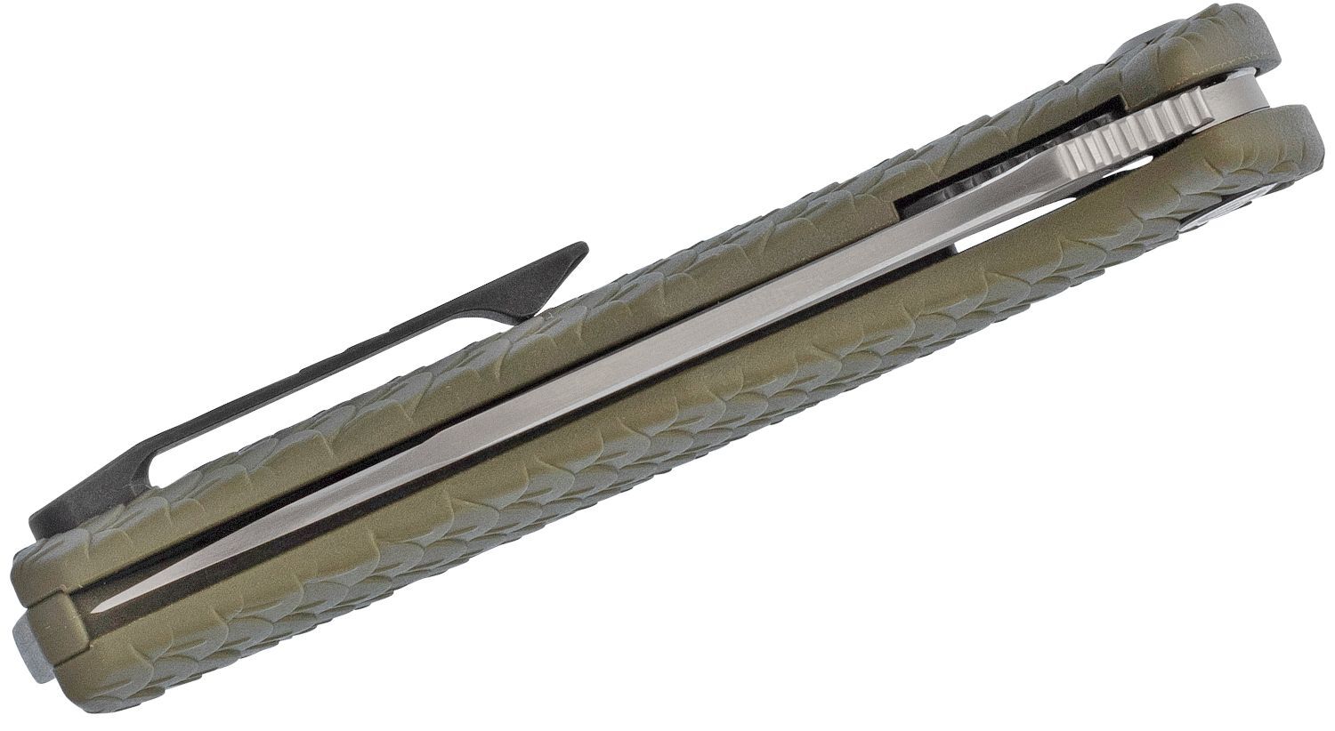Het model Wyvern komt met een slank ontwerp, gecombineerd met uitstekende materialen. Veelgebruikte staalsoorten zoals Bohler M390 of CPM-S35VN worden vervangen door gereedschapsstaal D2 (59-61HRC). Het handvatmateriaal is vervangen door getextureerd FRN. Het lemmet beweegt op roestvrijstalen lagers in de scharnier, wat het openen en sluiten van het mes aanzienlijk vergemakkelijkt. Het geopende mes wordt vergrendeld door een Liner Lock. De clip voor het dragen aan de broek is gemaakt van titanium. Het handvat is gefreesd, groen van kleur, met kleine schubben. Het ligt uitstekend in de hand en glijdt niet. Het heeft een opening voor het gebruik van een koord.