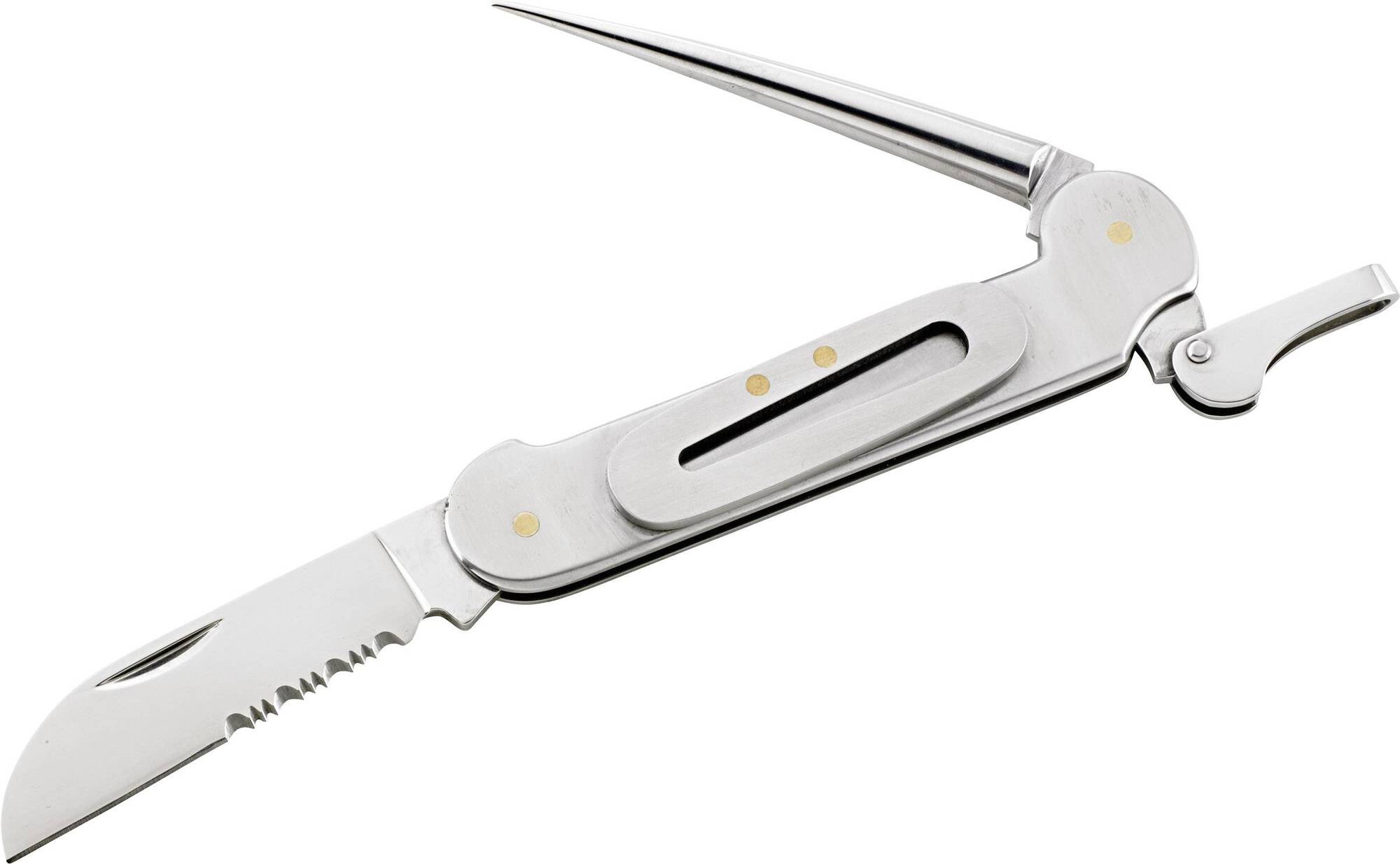 Een compact marine mes van het merk Herbertz, uitgerust met een gekarteld lemmet van roestvrij staal Cr13, een puntige stalen pin aan de andere kant en een boeienopener. De matte handgrepen zijn gemaakt van roestvrij staal 2 CR13.