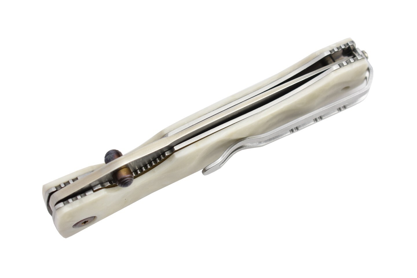 Mcusta MC-126D met een damascus lemmet en een handgreep van wit Corian. Het mes is in geopende toestand beveiligd met een Liner Lock. Het lemmet kan worden geopend met behulp van een duimstud.
