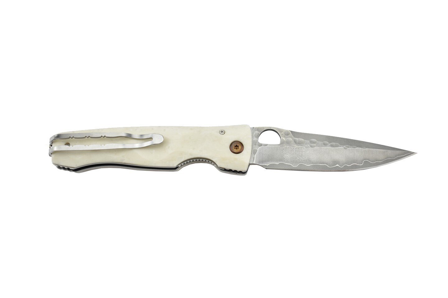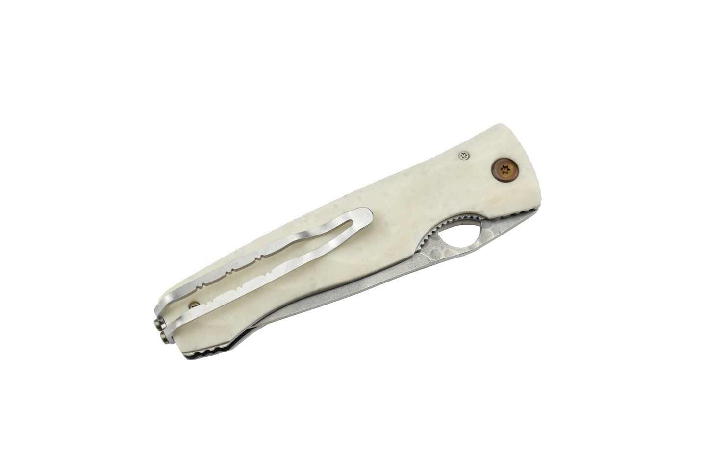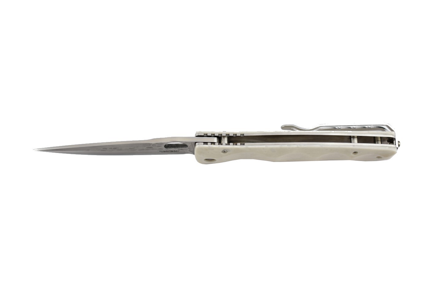 Mcusta mes met een lemmet van roestvrij staal SPG2. Het handvat is gemaakt van wit corian. Opening in het lemmet voor eenvoudig openen.