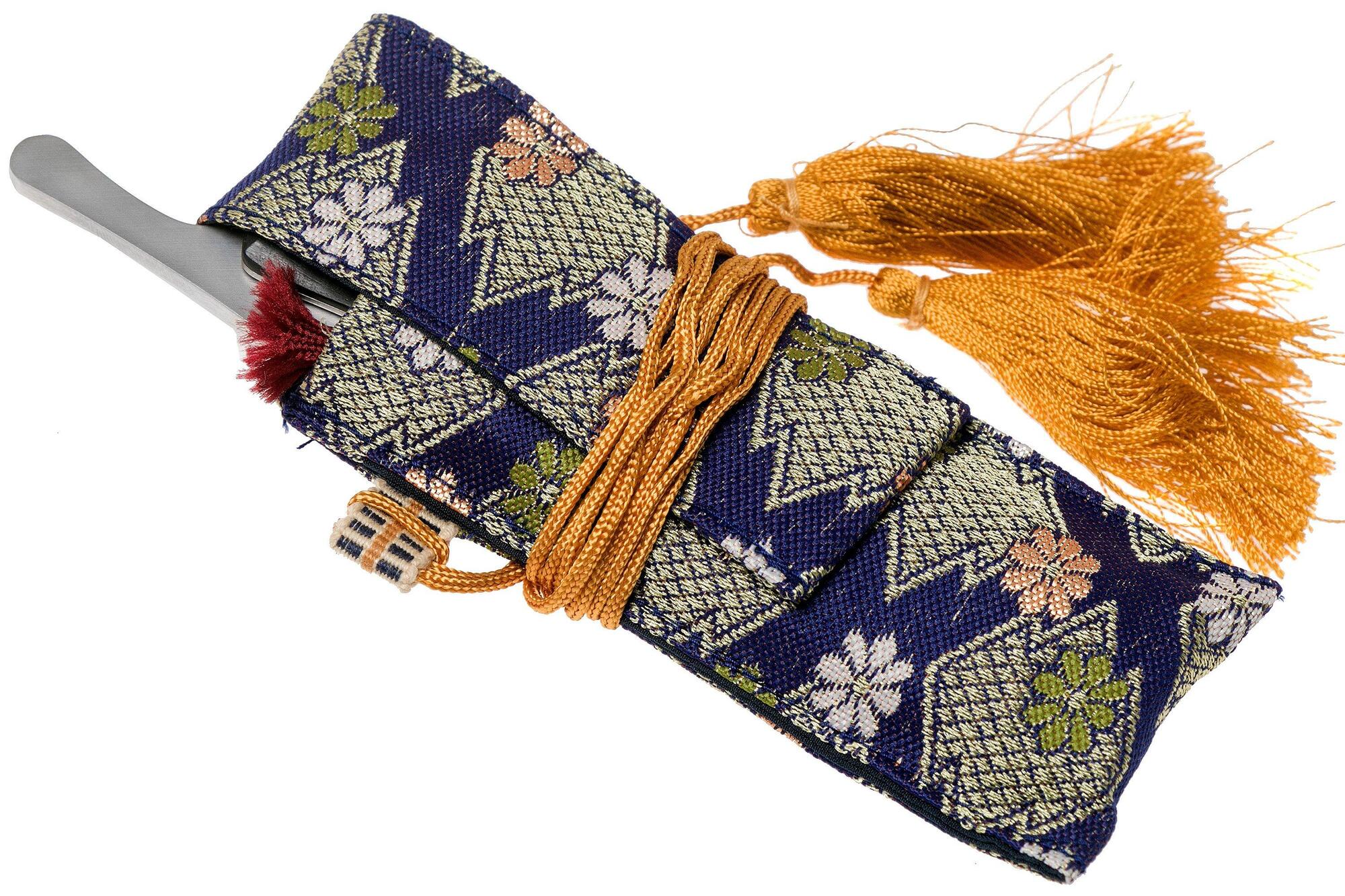 Het mes wordt geleverd in een traditioneel Japans etui met een opmerkelijk geweven patroon.