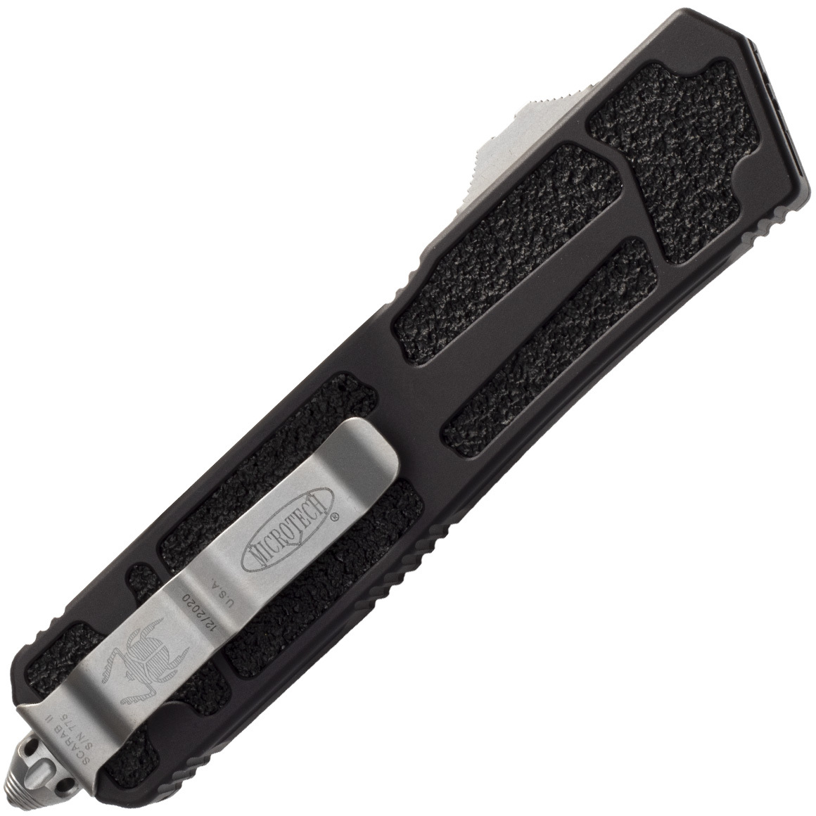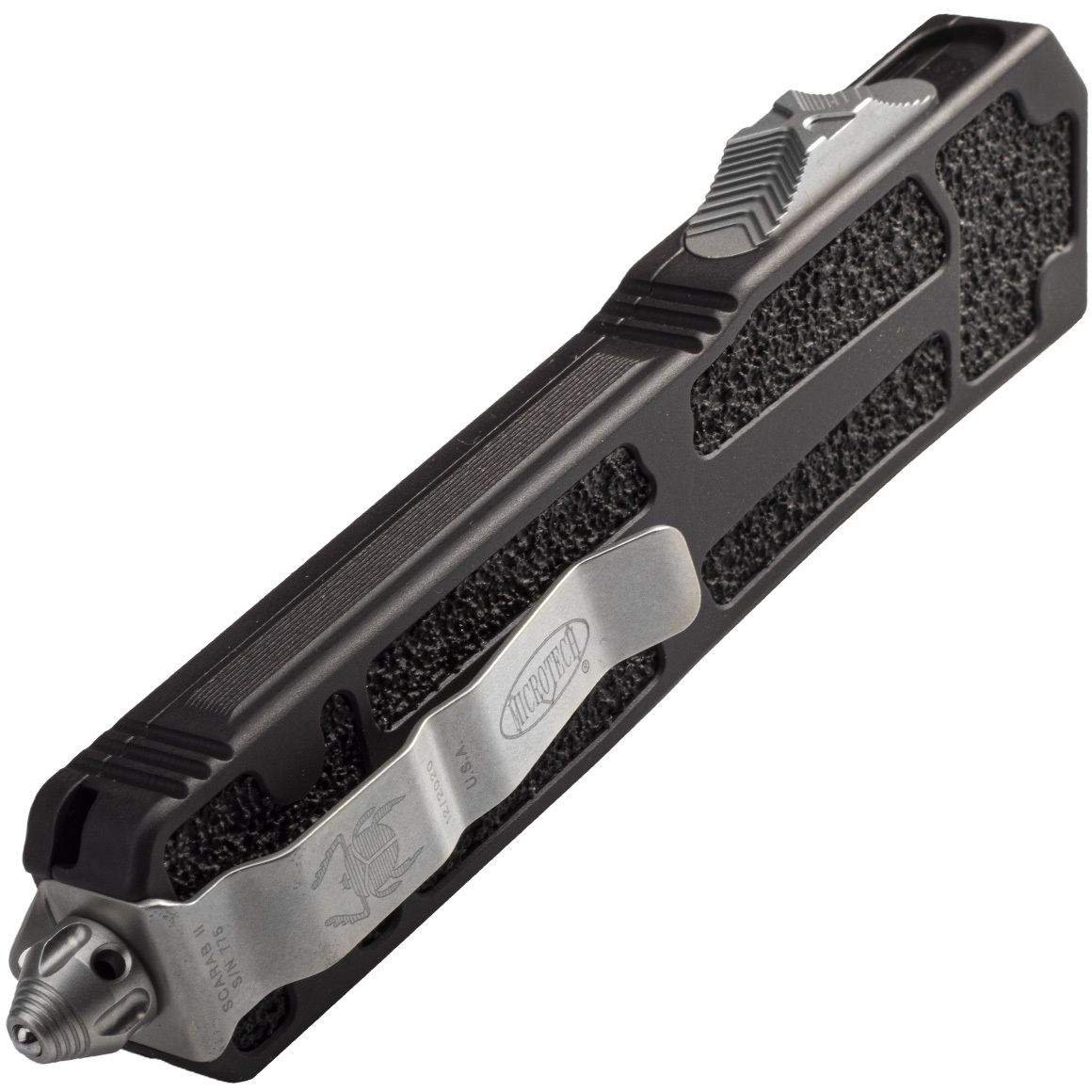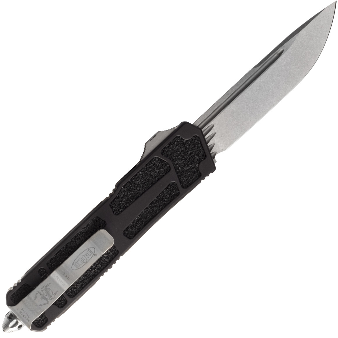 Dit mes heeft een ontwerp voor eenhandige opening. Gemakkelijk te openen en te sluiten. Het is een OTF-mes (Out The Front) met een dubbelzijdig lemmet. Het handvat heeft antislip inzetstukken, waardoor het uitstekend in de hand ligt, zelfs als het nat is. Aan het uiteinde heeft het een stalen punt. Het is ontworpen om extreme belastingen in speciale operaties te weerstaan. De Scarab II is vervaardigd volgens de hoogst mogelijke normen, waarbij betrouwbaarheid en veiligheid bij gebruik absoluut voorop staan. Het mes heeft een clip voor het dragen aan een zak of riem.