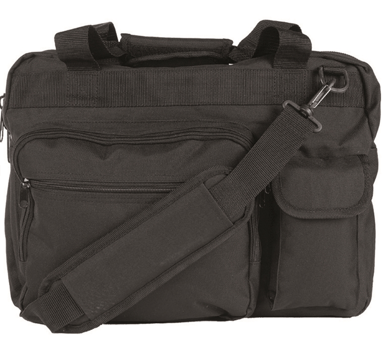 Zwarte aktetas voor het dragen van documenten of een laptop, notebook van Mil-Tec, gemaakt van polyester met een PVC-coating. Het heeft een afneembare gewatteerde schouderriem, een gewatteerd handvat en 2 buitenvakken met verschillende compartimenten.