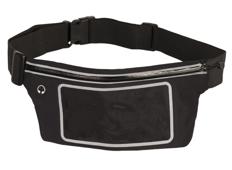 Het platte ontwerp is onzichtbaar onder kleding, met een hoofdvak met rits en aan de voorkant een transparant vak voor een mobiele telefoon (bediening via het vak mogelijk), en een opening voor oortjes. Waterbestendig en met reflecterende strepen.