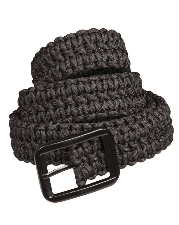 Praktische paracord riem van Mil-Tec in zwart met een matzwarte metalen gesp. Met een breedte van 4 cm en een lengte van 130 cm. De riem kan ook veelzijdig worden gebruikt als een touw van 33 m. Met een minimale belasting van ongeveer 217 kg.