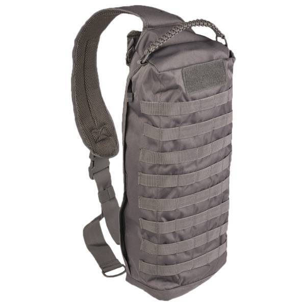 Verlengde tas met een 11 cm brede schouderriem Mil-Tec SLING BAG TANKER in grijze Urban kleur van 100% polyester (Oxford) gecoat met PVC, met polyester voering en EVA schuimvulling. Met een inhoud van ongeveer 15 liter.