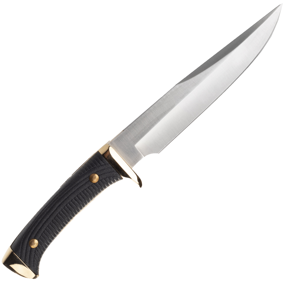 Praktisch outdoor mes Muela 3160 voor kamperen, wandelen of scouting. Met een vast lemmet met een gladde snede van roestvrij staal Inos 1-42, type Long Leaf. Het handvat is van zwart kunststof en heeft een messing enkele stootplaat en pommel. Wordt geleverd met een leren schede.