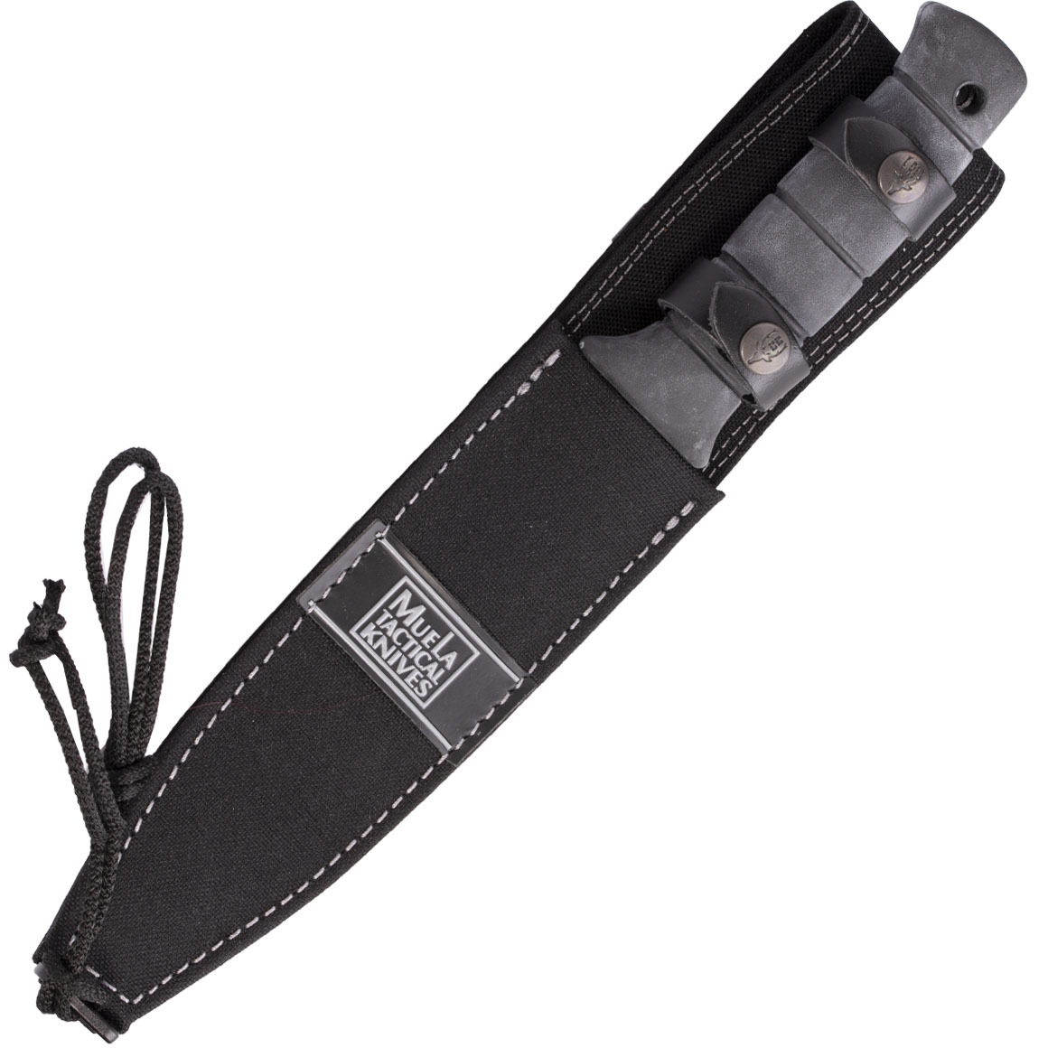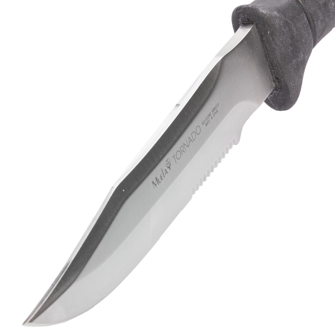 Het tactische en robuuste mes Muela TORNADO-18W heeft een bowie-vormig lemmet van hoogwaardig X50CrMoV15 staal en is gedeeltelijk gekarteld, met een scherpe punt. Het handvat is geribbeld en gemaakt van kunststof, heeft een korte stootplaat en een koordoog aan het uiteinde. Wordt geleverd met een nylon schede en een koord om aan het dijbeen te bevestigen.