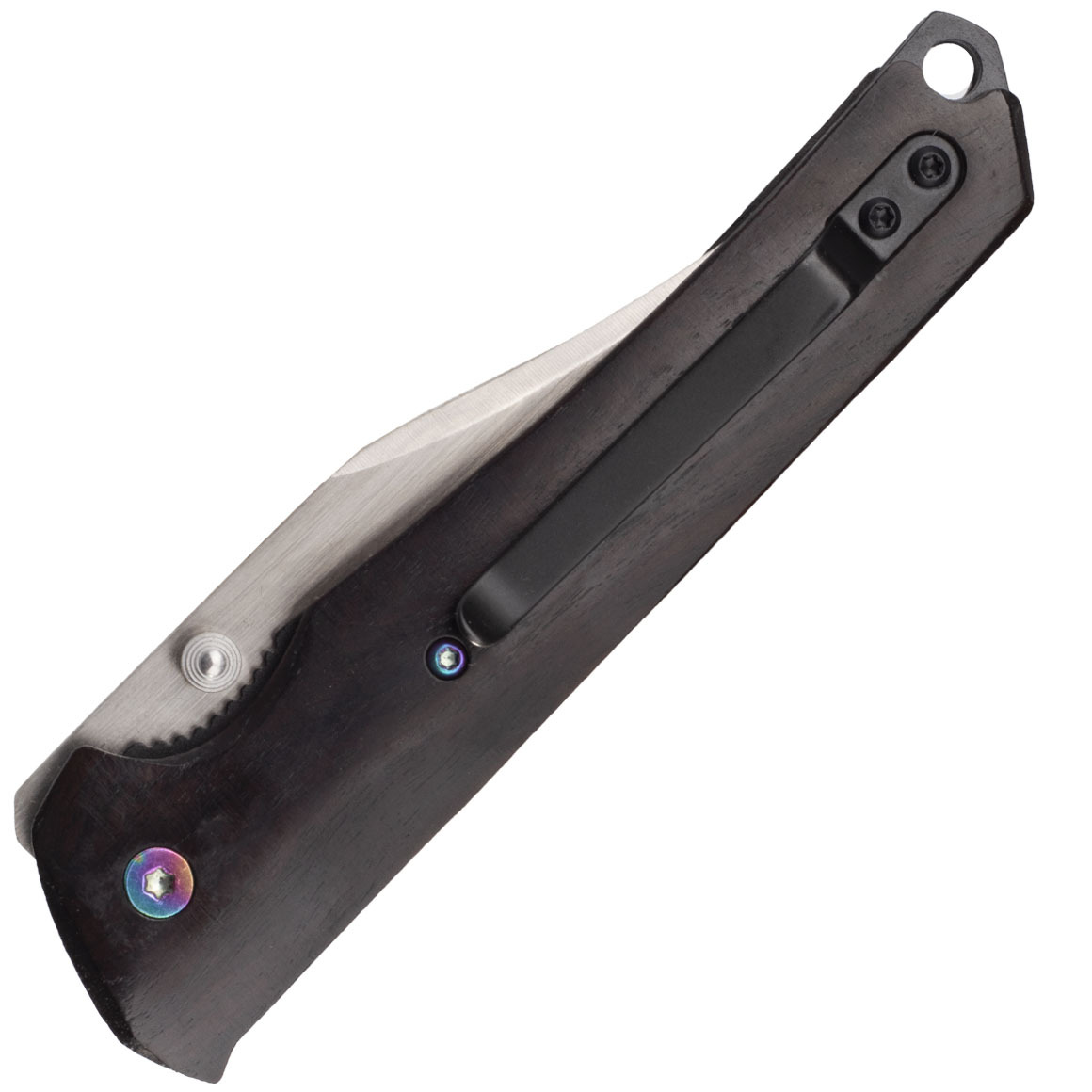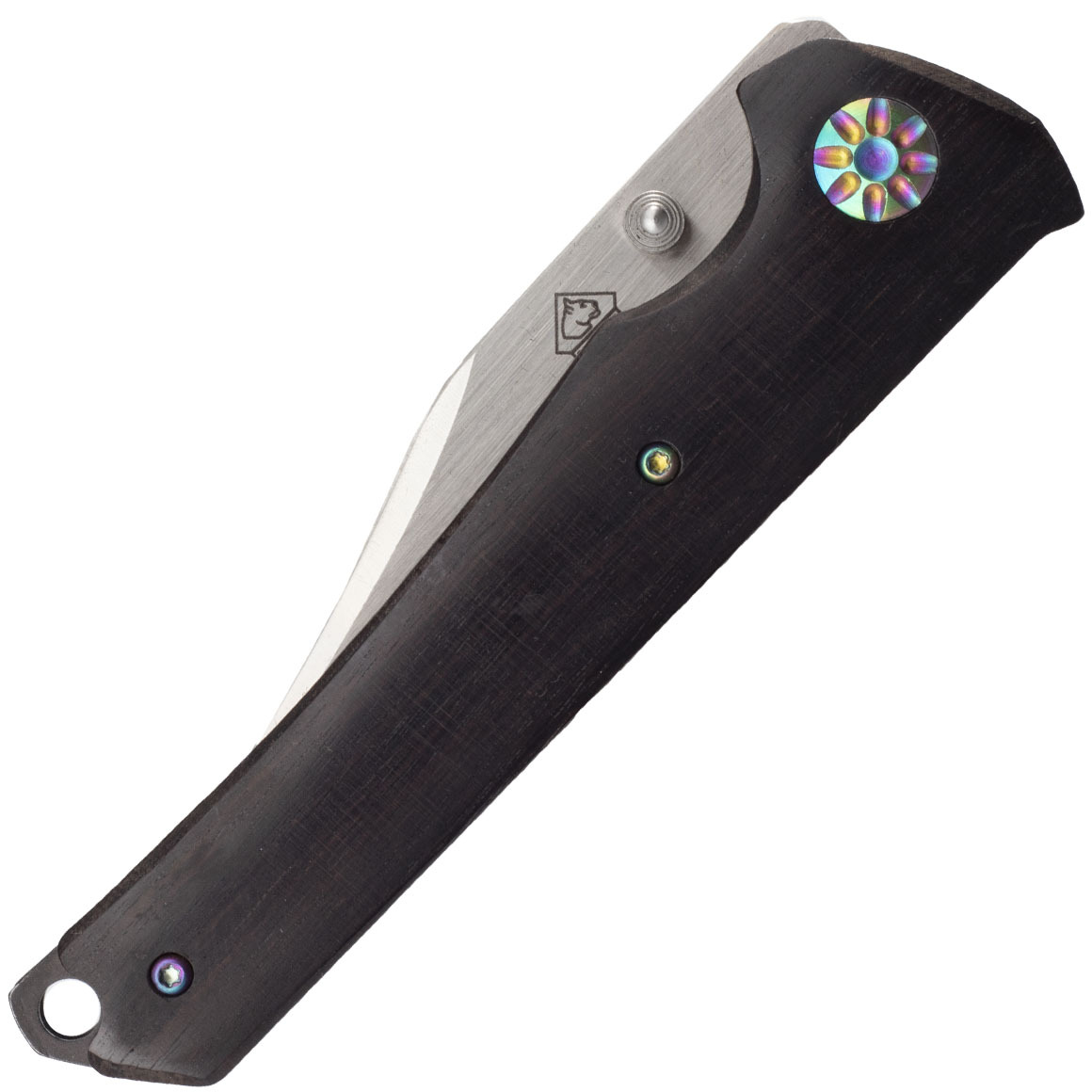 Het zakmes Puma TEC 306511 voor dagelijks gebruik (EDC) heeft een gladde snede van D2 koolstofstaal, opent met één hand via duimstuds en wordt vergrendeld door een Liner Lock. Het handvat is gemaakt van donker ebbenhout met een iriserende clip, een koordoog en een broekclip.