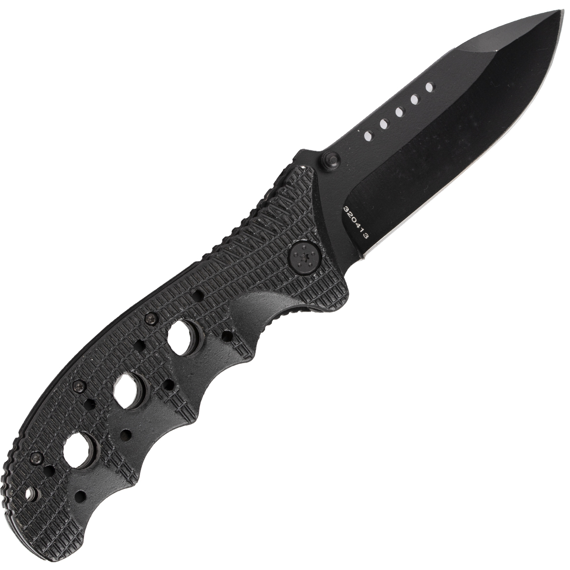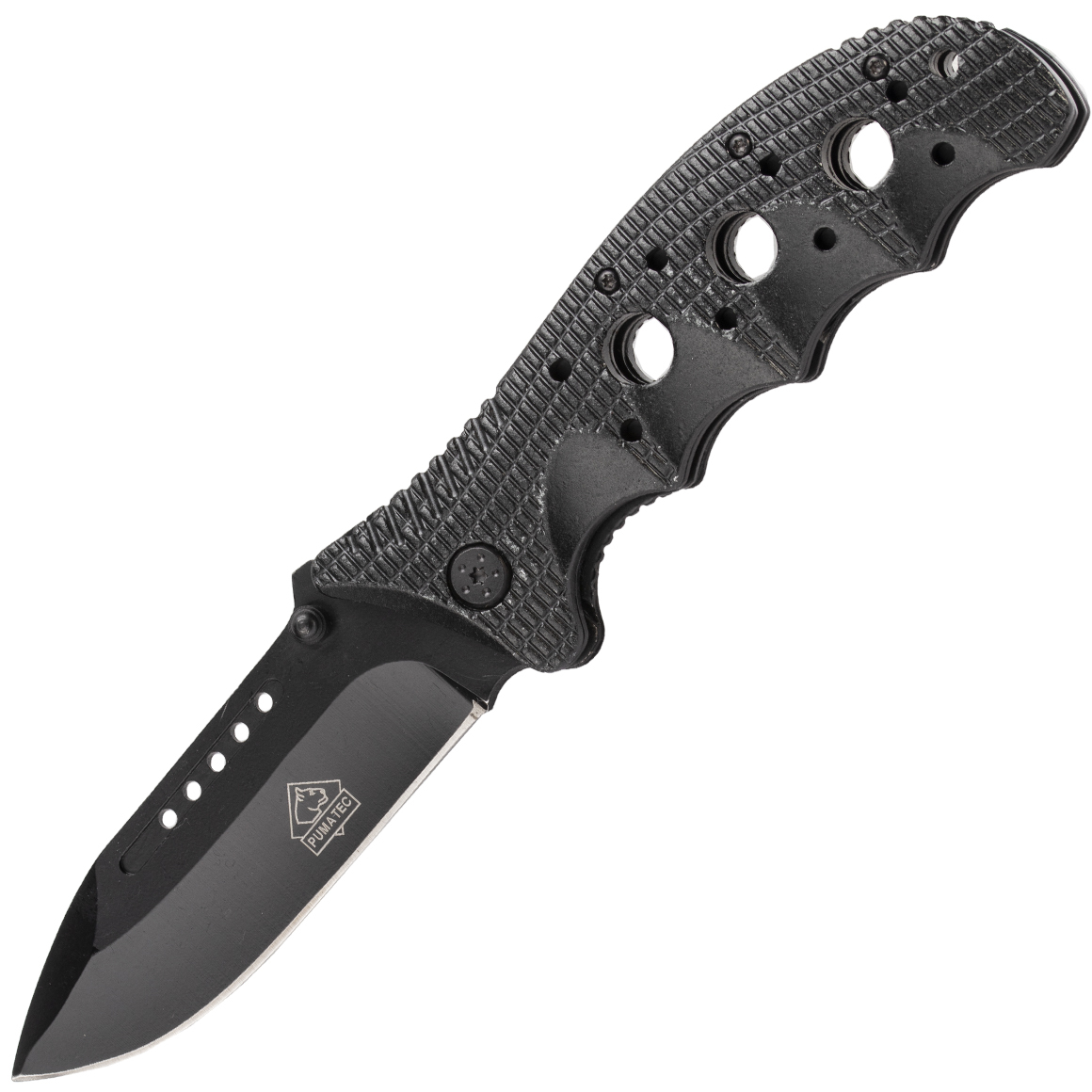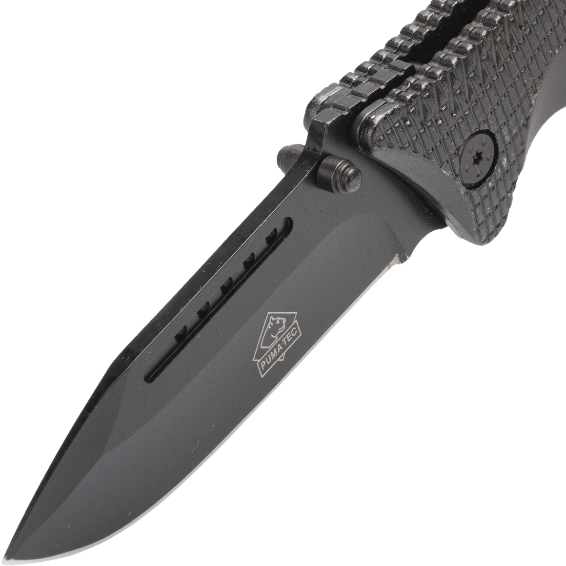 Outdoor vouwmes Puma TEC 320413 met een volledig metalen constructie heeft een lemmet met een gladde snede van roestvrij staal AISI 420 met een zwarte afwerking, opent met duimstuds en wordt vergrendeld door een Liner Lock. Het handvat is van zwart metaal met antislip ribbeling en ontlastingsgaten.