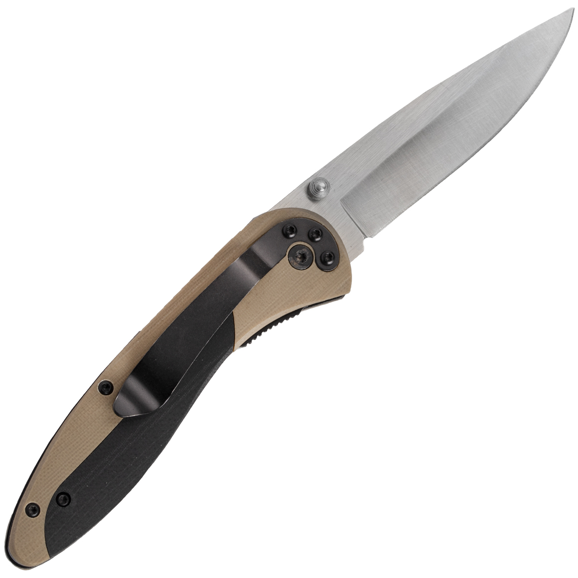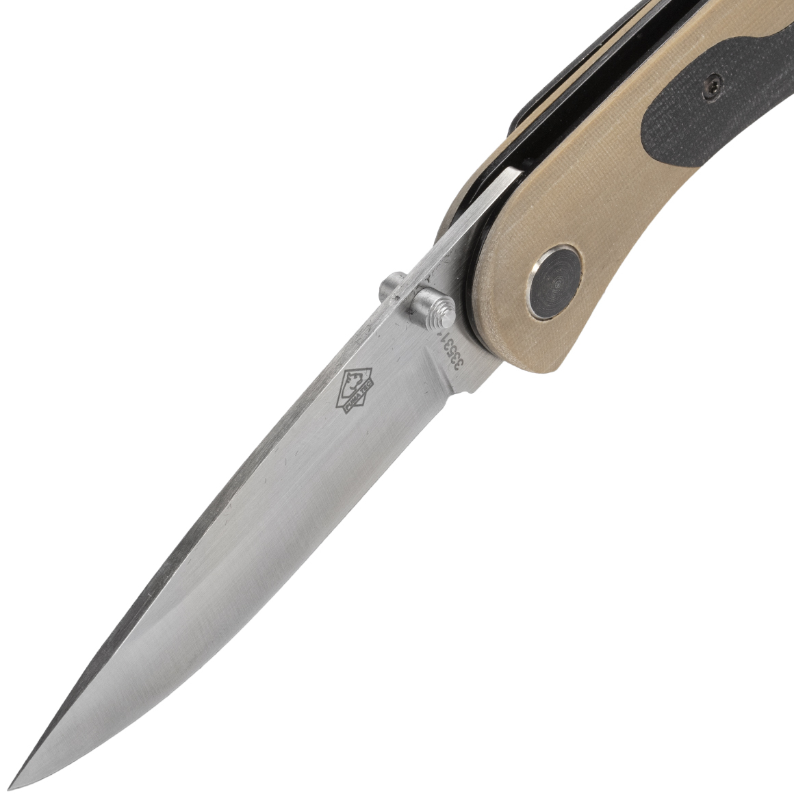 Jacht- en alledaags (EDC) zakmes Puma TEC 335311 met een gladde snede van roestvrij koolstofstaal D2, opent met duimstuds en wordt vergrendeld door een Liner Lock. Het handvat is gemaakt van G10 in kaki en zwart met een koordoog en een broekclip. Wordt geleverd met een kaki paracord armband.