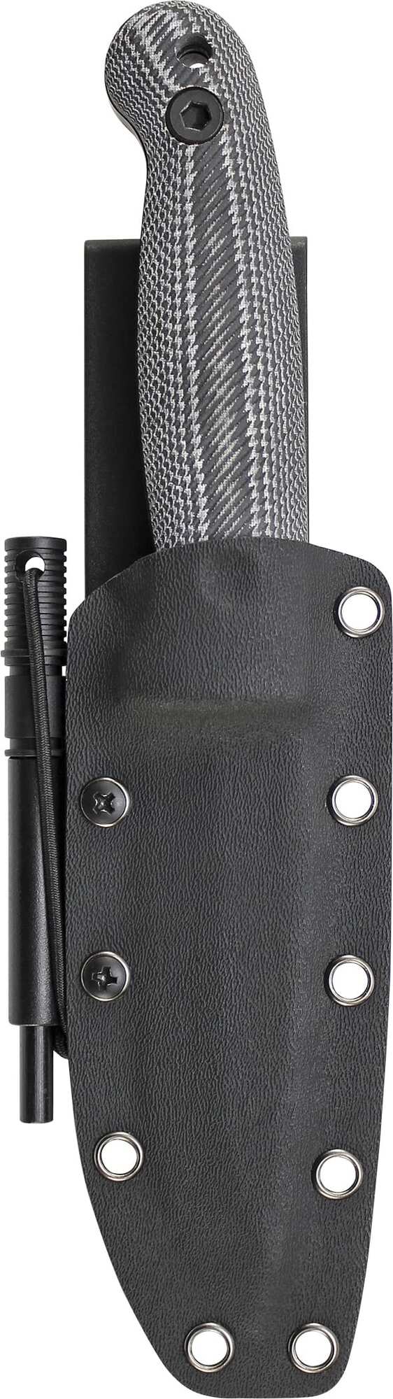 Een middelgroot, robuust Schrade mes met vaste lemmet van 1095 High Carbon Steel met een zwarte afwerking en een Micarta handvat met een koordoog. Het wordt geleverd met een thermoplastische schede met ferro staaf.