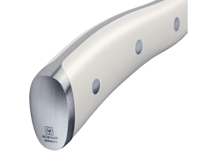 Het elegante witte handvat is gemaakt van het zeer stevige materiaal POM. Het is bestand tegen hitte, schokken en zuren, en is gemakkelijk schoon te houden. Een ideaal materiaal voor de keukenomgeving. Ergonomisch gevormd, sluit naadloos aan op het lemmet en is stevig bevestigd met drie klinknagels.
