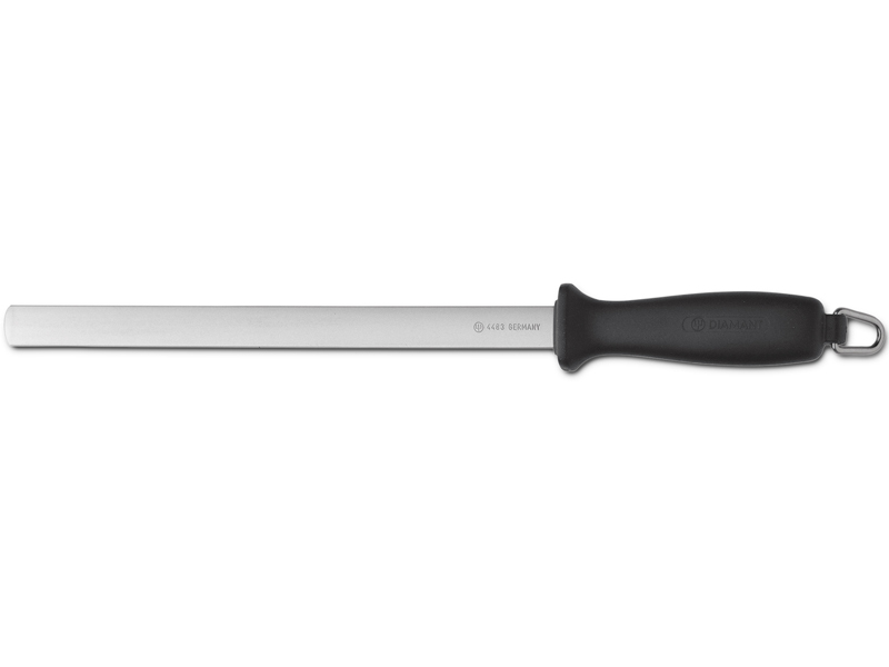 De platte diamanten slijpstaaf van Wüsthof met een harde verchroomde lemmet van 26 cm en een fijne korrel J 240, met een stalen kern bedekt met industriële diamanten - deze dienen voor het slijpen van botte messen. Het handvat is gemaakt van schokbestendig zwart synthetisch materiaal.