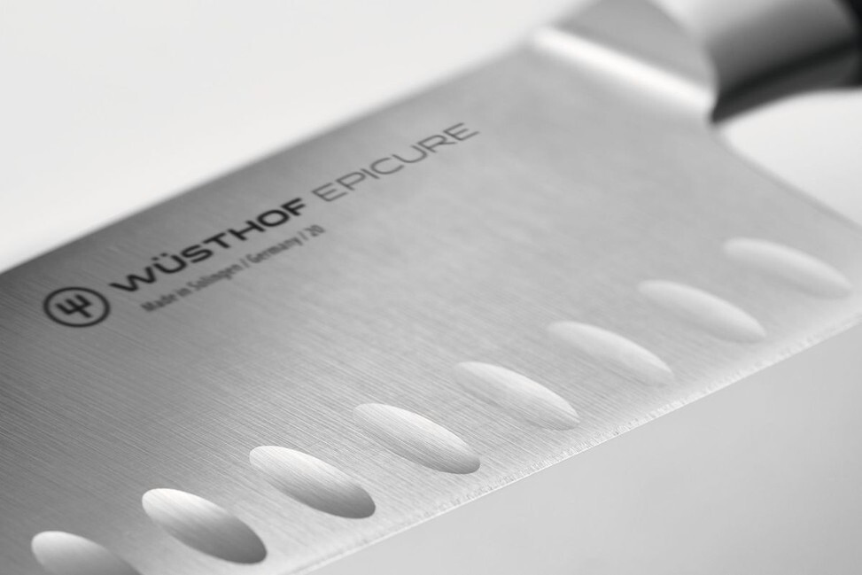 De Santoku mes Epicure is een klassieker onder de Japanse messen. Het is ideaal voor het snijden van vlees en groenten en het hakken van kruiden. De uitsparingen op het lemmet voorkomen dat plakjes voedsel aan het lemmet blijven kleven. Vanwege zijn grootte en lichtheid is het bijzonder geschikt voor vrouwen. Het handvat is gemaakt van natuurlijke vezels en hars, waardoor het aanvoelt als hout maar net zo duurzaam is als plastic. De speciale vorm van de kop en het bredere lemmet maken efficiënter en veiliger werken mogelijk, wat vriendelijker is voor de gewrichten. Het mes is gesmeed uit hooggelegeerd staal X50CrMoV15 en gehard tot 58° Rockwell, wat zorgt voor een lange scherptebehoud en tegelijkertijd goede slijpbaarheid.