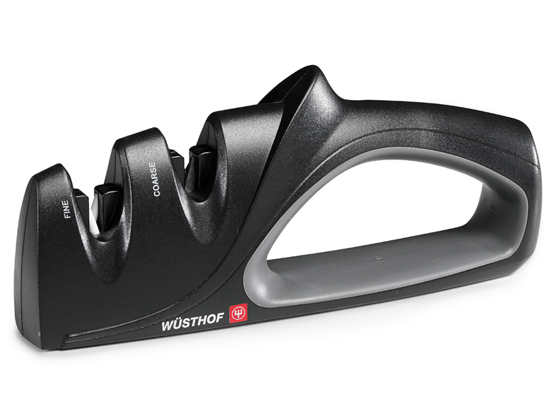 - Wusthof tweestaps slijper met een carbide en keramisch slijpgedeelte, ook geschikt voor gekartelde messen, met een zachte antislip handgreep