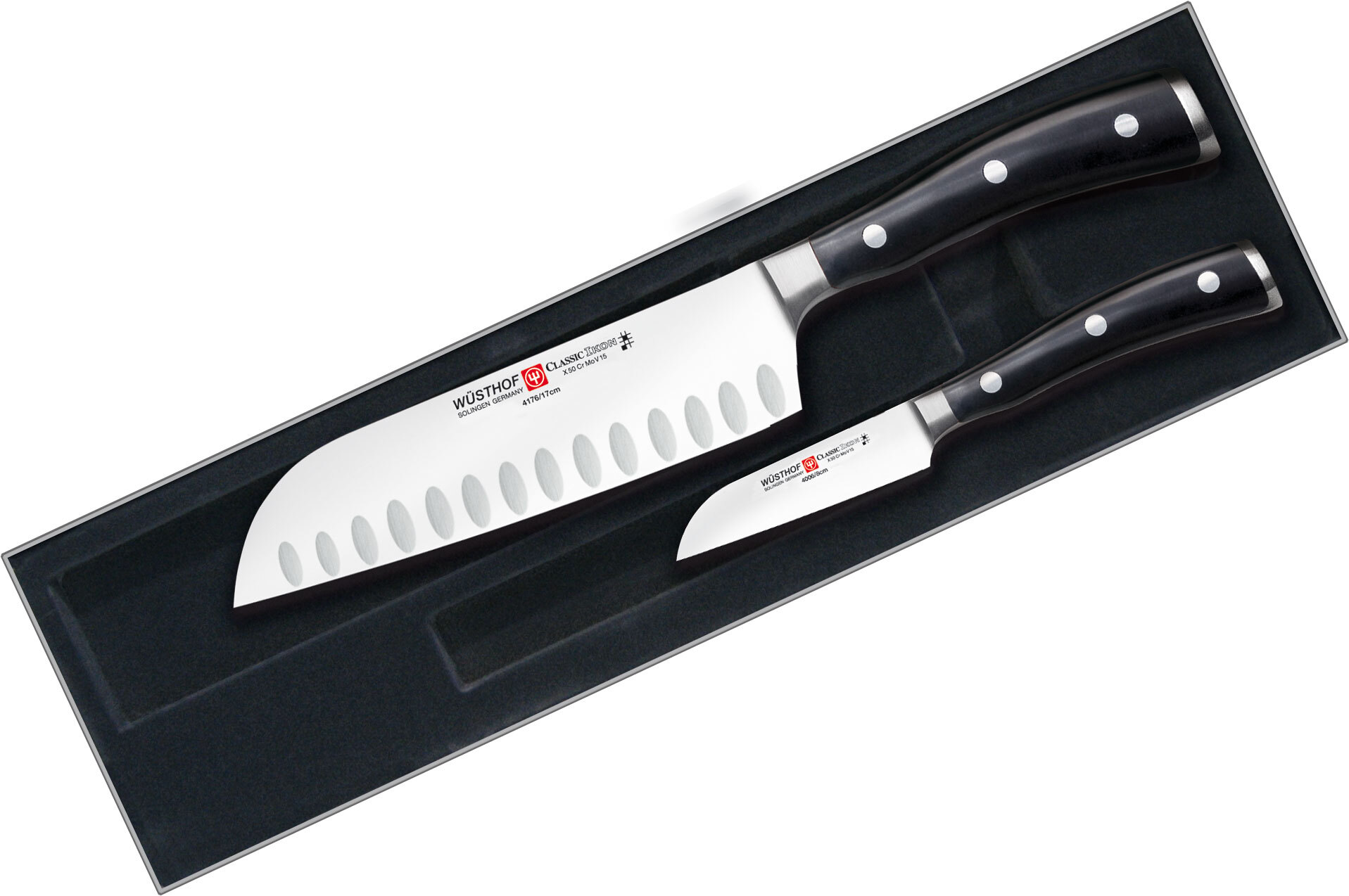 De Wusthof Classic IKON startset bestaat uit 2 keukenmessen met een vast lemmet en een gladde snede van chroom-molybdeen-vanadium staal en een handvat van zwart synthetisch materiaal.