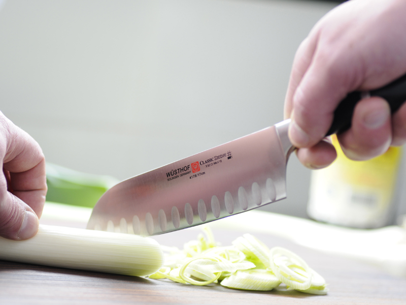 - Wusthof Classic IKON Santoku voor het bereiden van diverse gerechten met een lemmet met anti-kleef groeven, met een lengte van 17 cm