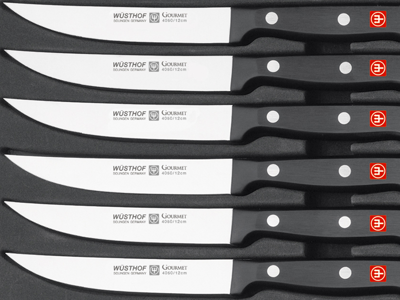 Set van 6 Wusthof Gourmet messen voor steak en andere soorten vleesgerechten met stevige lemmeten van 12 cm gemaakt van roestvrij staal en handgrepen van zwart synthetisch hygiënisch materiaal.