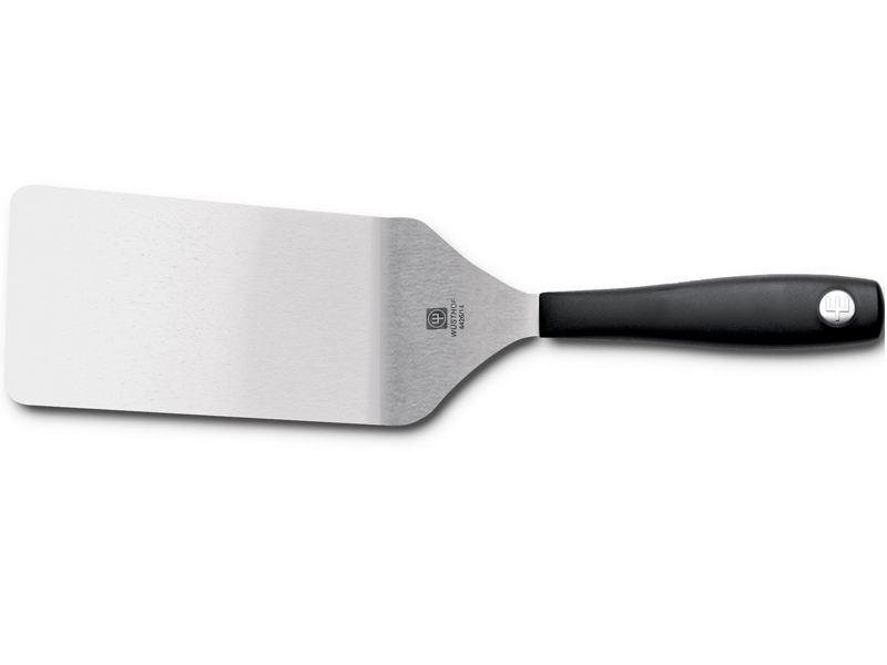 Wüsthof SILVERPOINT spatel met een stalen lemmet van 14 cm voor het omdraaien en uitnemen van gerechten uit de pan, evenals voor het serveren en portioneren van lasagne. Handvat van zwart synthetisch materiaal POM.