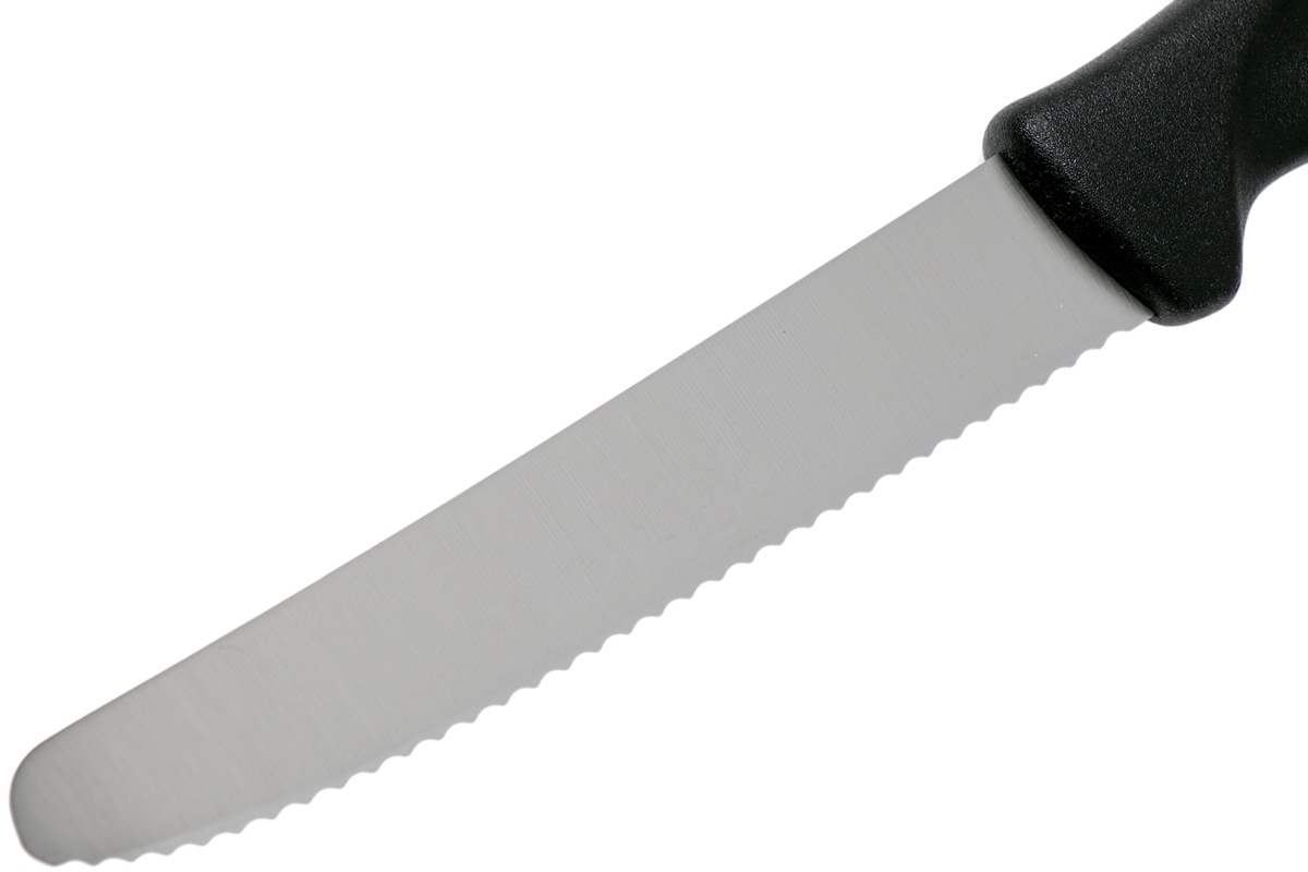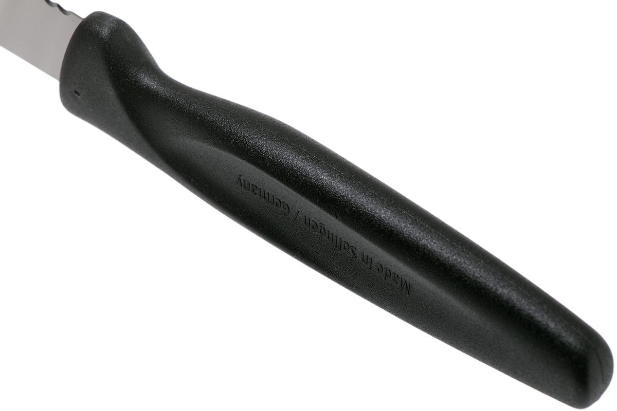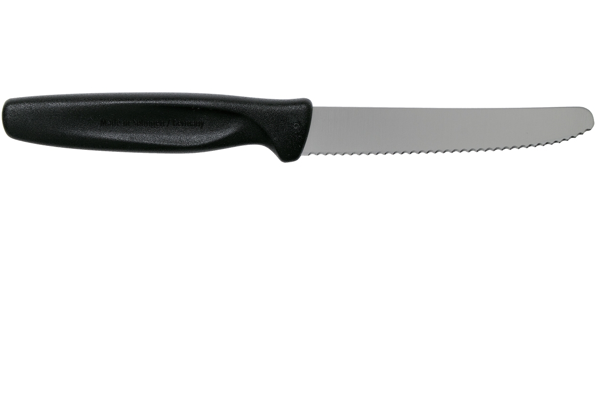 Een universeel mes, vooral geschikt voor het snijden van tomaten, groenten en fruit met een stevige schil. Ook ideaal voor harde worsten, brood en kazen. Perfect geschikt voor elk kleiner hakwerk. Het heeft een gekarteld lemmet van 10 cm van roestvrij staal. Het handvat is van zwart kunststof en ligt comfortabel in de hand. Geschikt voor de vaatwasser.