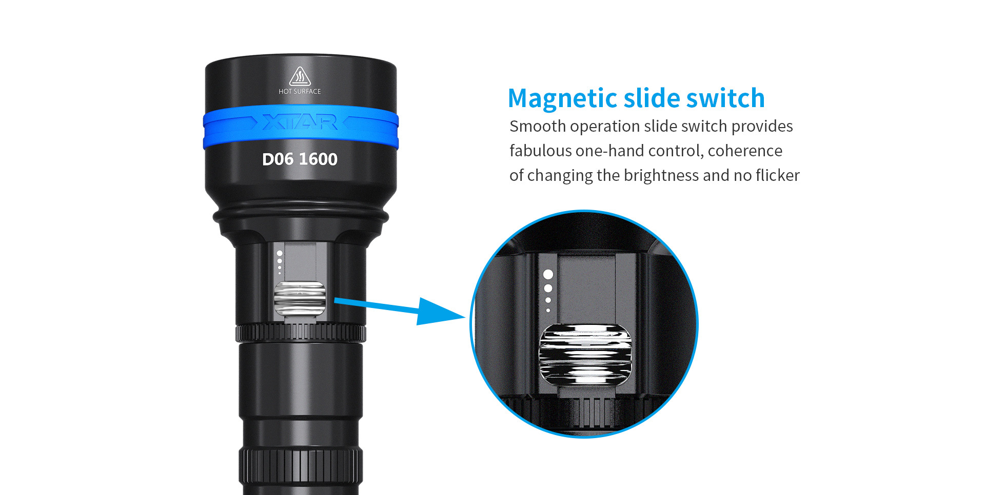 - Aan- en uitschakelen en lichtintensiteit instellen met een schuifbare magnetische schakelaar